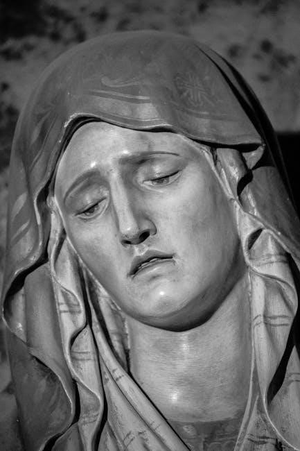 Further sorrows include the Loss of Jesus at the Temple, Meeting Jesus on the Way to Calvary, and the agonizing Crucifixion itself. The sorrow extends to Taking Down the Body of Jesus and finally, the Burial of Jesus. Each sorrow, detailed within the PDF novena, invites contemplation and empathy, deepening our connection to Mary’s maternal heart and the redemptive power of Christ’s sacrifice.